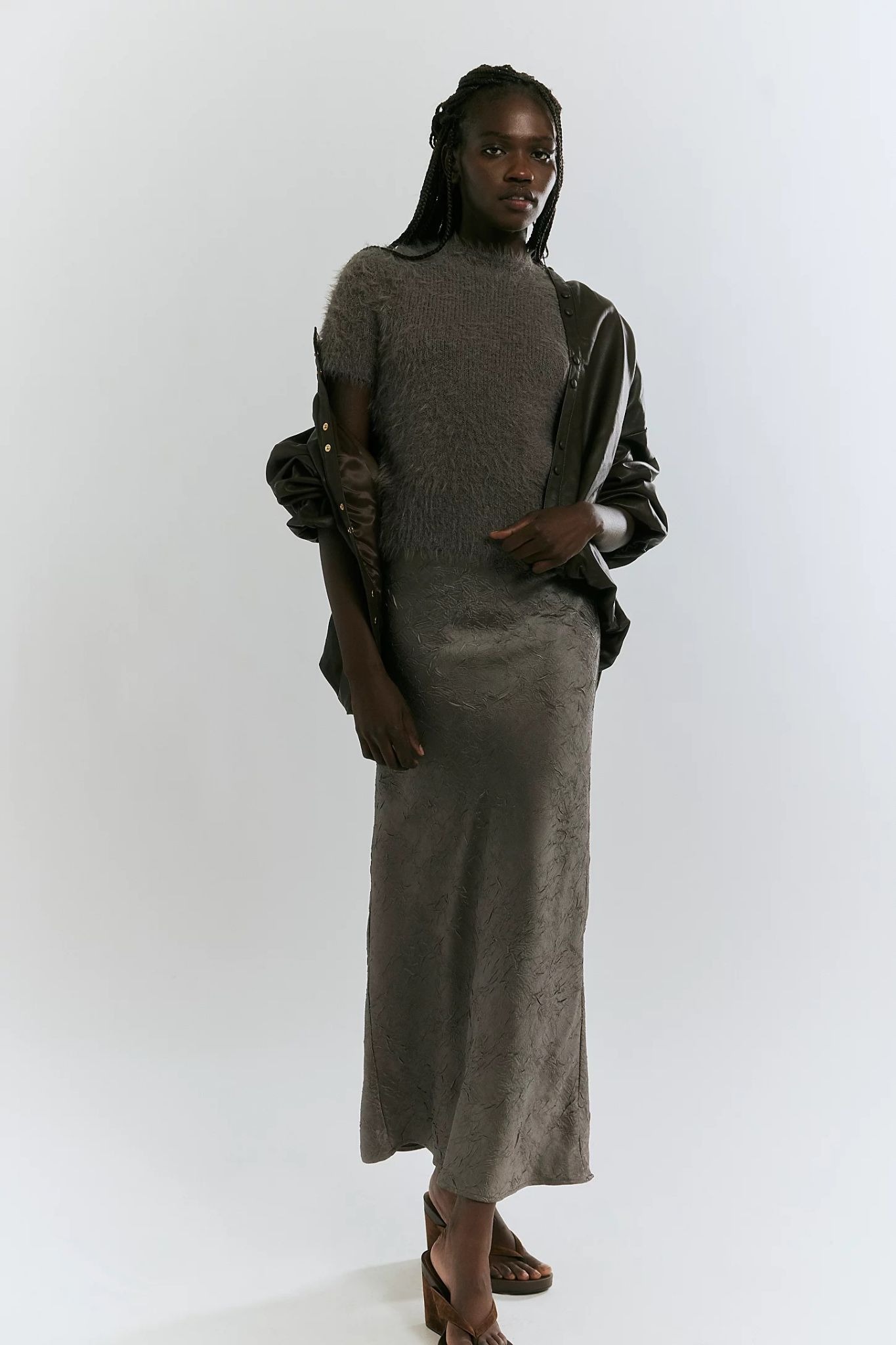This airy skirt brings a romantic ease to the mountains, with a seductive crushed satin that pairs perfectly with boots or chunky knits.