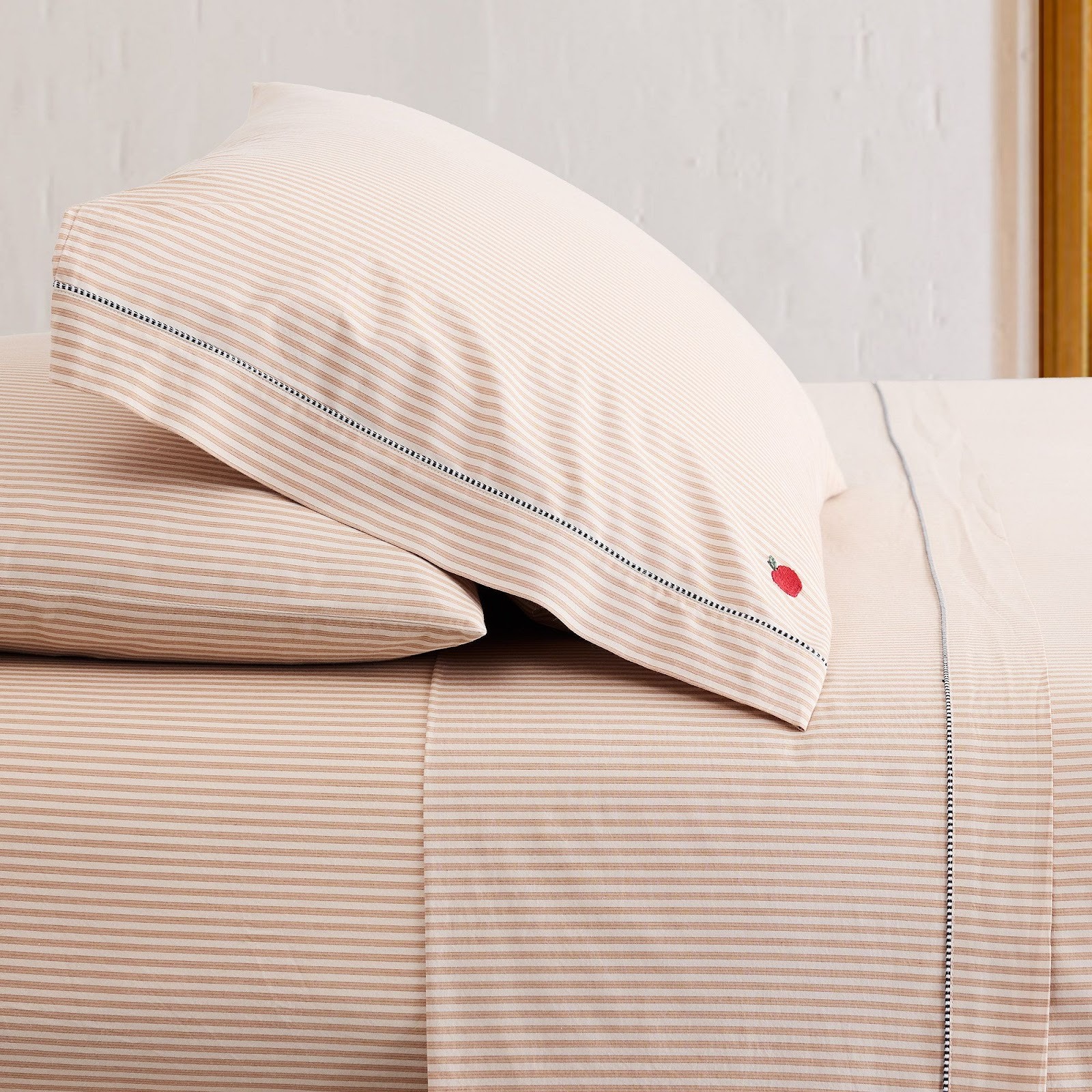 This bedding set reworks a classic stripe with a barely-there embroidered apple.The palette stays neutral, but the texture adds dimension — making an easy yet impactful bedroom update.